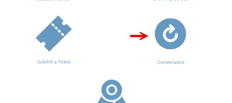 After clicking on Support, you will look for an icon with the revolving arrow labeled Conversions.